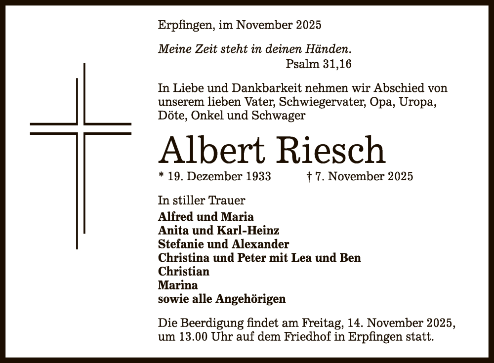 Hier finden Sie alle Traueranzeigen aus der Zeitung, die bisher für Albert Riesch erschienen sind. Weitere Traueranzeigen, die in der Zeitung erscheinen, werden hier ebenfalls aufgelistet