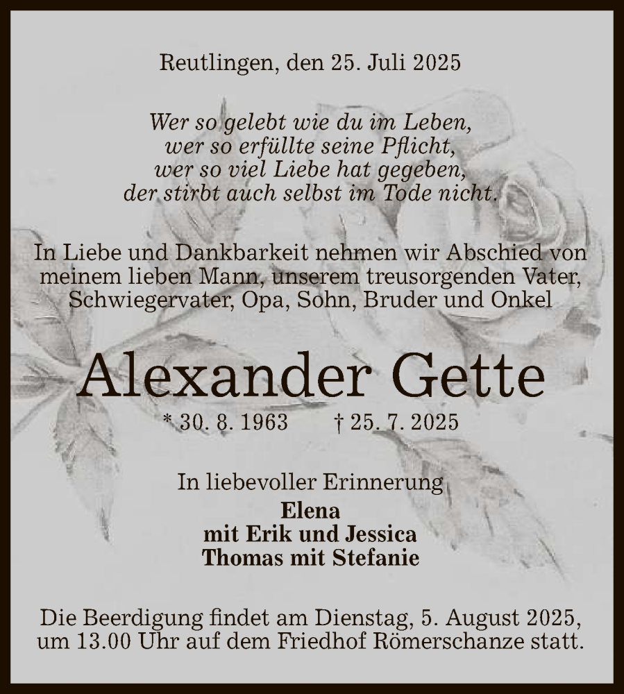 Hier finden Sie alle Traueranzeigen aus der Zeitung, die bisher für Alexander Gette erschienen sind. Weitere Traueranzeigen, die in der Zeitung erscheinen, werden hier ebenfalls aufgelistet