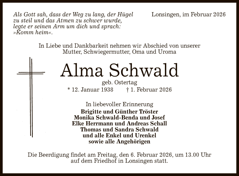 Hier finden Sie alle Traueranzeigen aus der Zeitung, die bisher für Alma Schwald erschienen sind. Weitere Traueranzeigen, die in der Zeitung erscheinen, werden hier ebenfalls aufgelistet