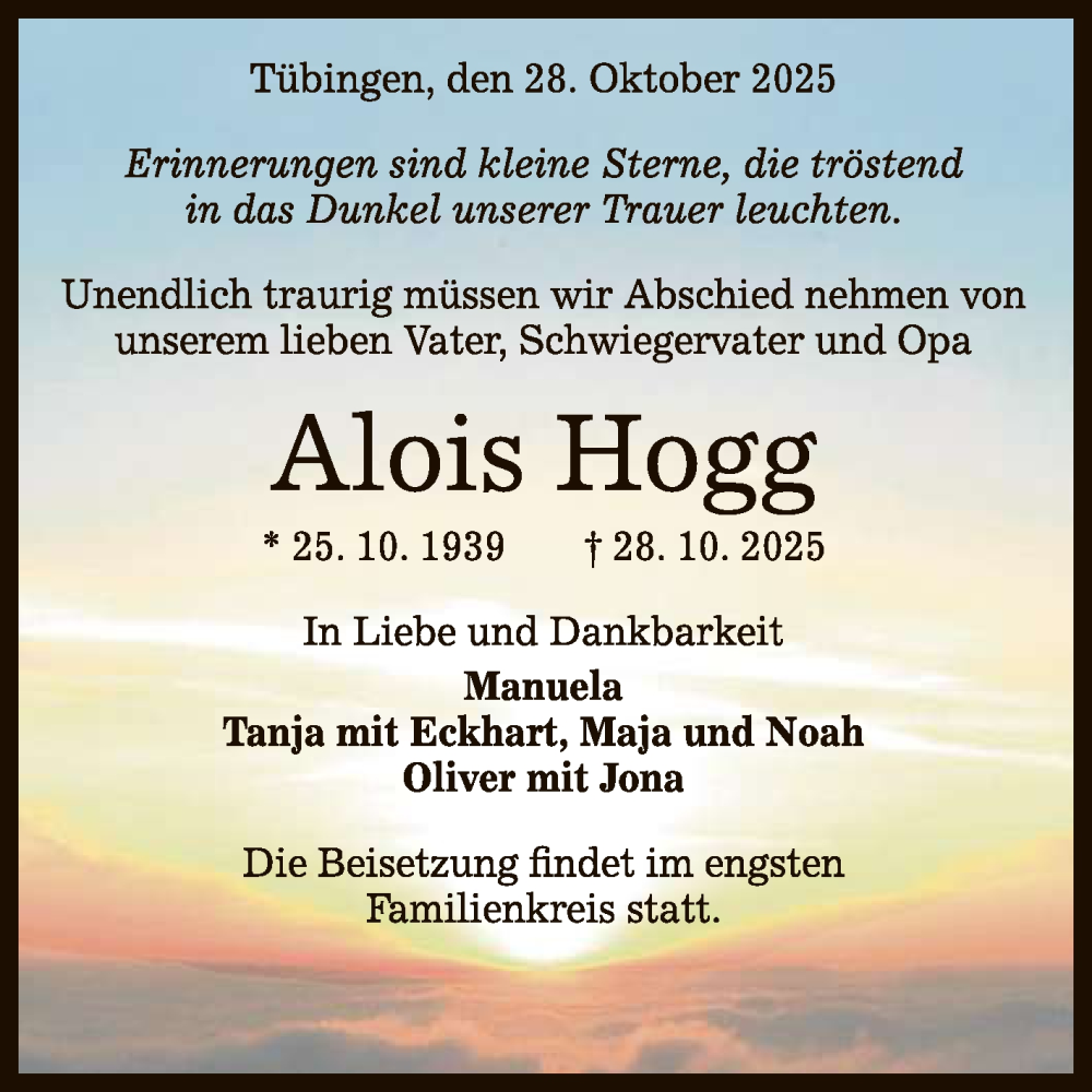 Hier finden Sie alle Traueranzeigen aus der Zeitung, die bisher für Alois Hogg erschienen sind. Weitere Traueranzeigen, die in der Zeitung erscheinen, werden hier ebenfalls aufgelistet