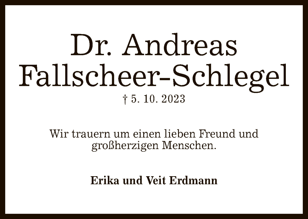 Hier finden Sie alle Traueranzeigen aus der Zeitung, die bisher für Andreas Fallscheer-Schlegel erschienen sind. Weitere Traueranzeigen, die in der Zeitung erscheinen, werden hier ebenfalls aufgelistet