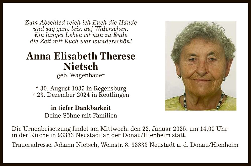 Hier finden Sie alle Traueranzeigen aus der Zeitung, die bisher für Anna Elisabeth Therese Nietsch erschienen sind. Weitere Traueranzeigen, die in der Zeitung erscheinen, werden hier ebenfalls aufgelistet