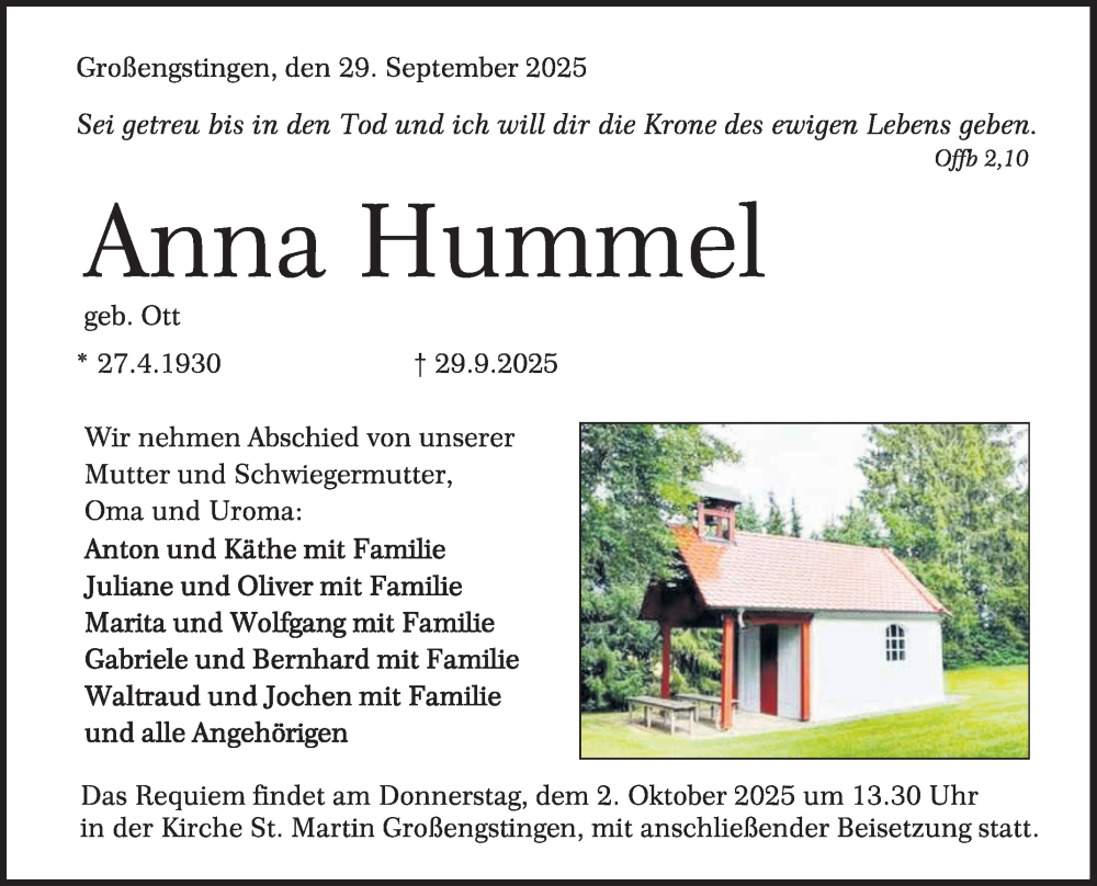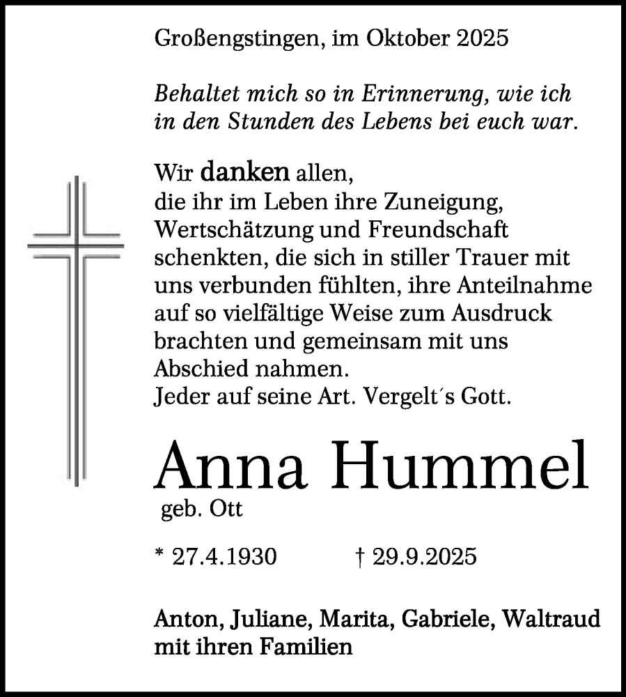 Hier finden Sie alle Traueranzeigen aus der Zeitung, die bisher für Anna Hummel erschienen sind. Weitere Traueranzeigen, die in der Zeitung erscheinen, werden hier ebenfalls aufgelistet
