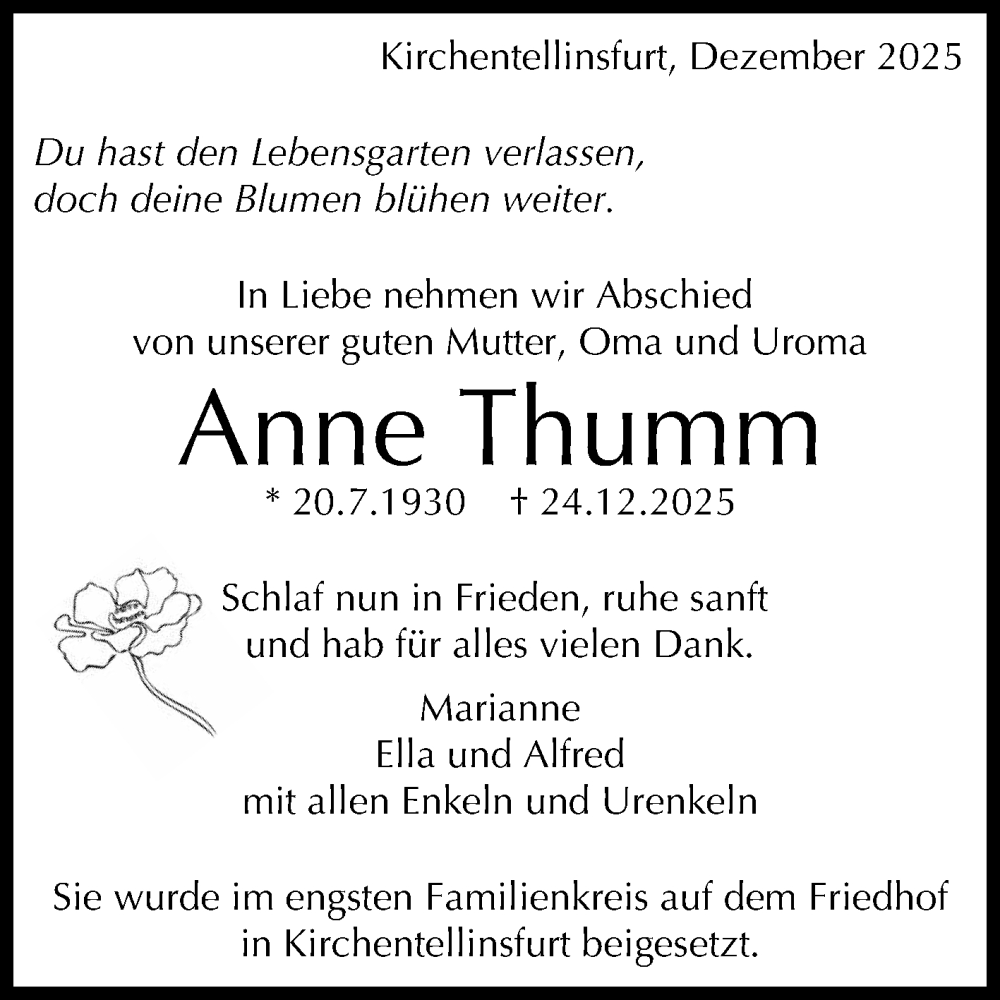 Hier finden Sie alle Traueranzeigen aus der Zeitung, die bisher für Anne Thumm erschienen sind. Weitere Traueranzeigen, die in der Zeitung erscheinen, werden hier ebenfalls aufgelistet