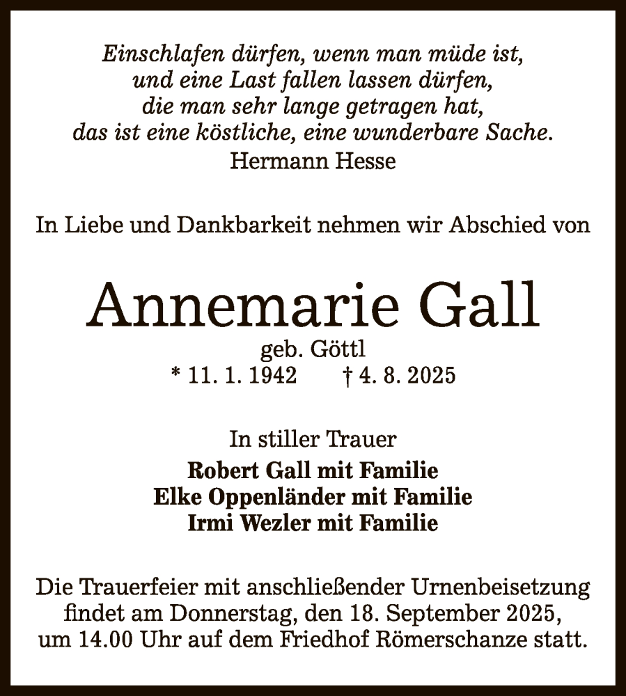 Hier finden Sie alle Traueranzeigen aus der Zeitung, die bisher für Annemarie Gall erschienen sind. Weitere Traueranzeigen, die in der Zeitung erscheinen, werden hier ebenfalls aufgelistet