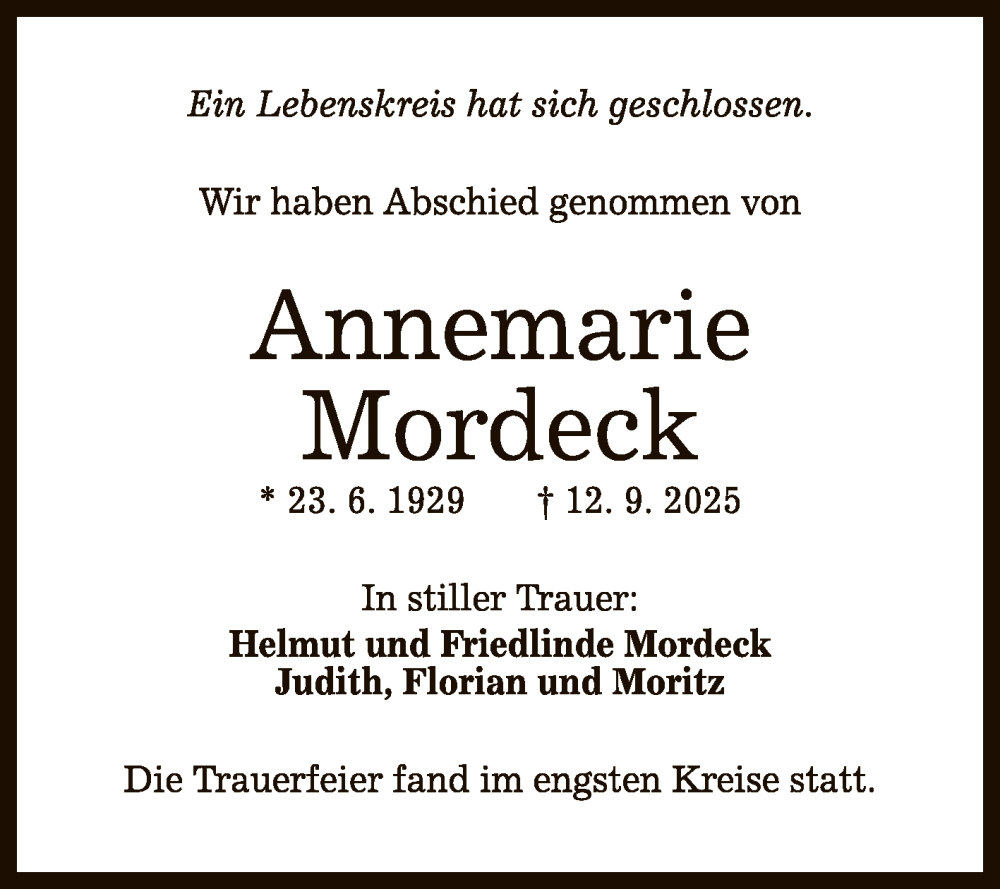 Hier finden Sie alle Traueranzeigen aus der Zeitung, die bisher für Annemarie Mordeck erschienen sind. Weitere Traueranzeigen, die in der Zeitung erscheinen, werden hier ebenfalls aufgelistet