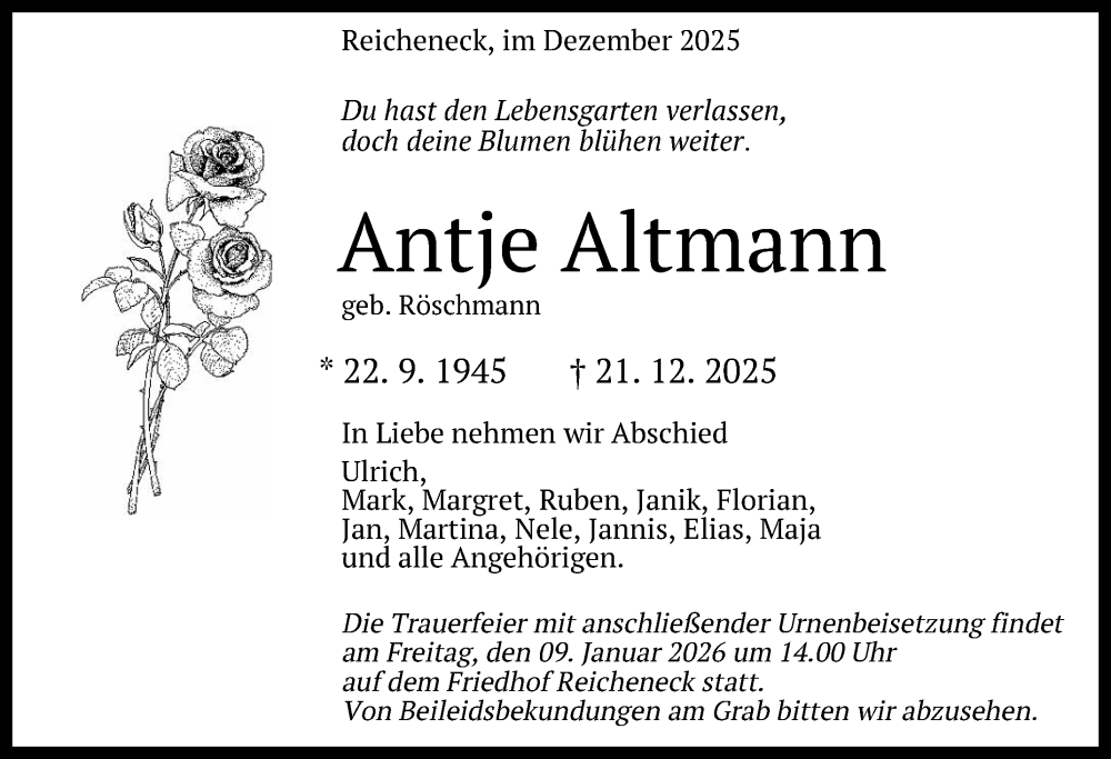 Hier finden Sie alle Traueranzeigen aus der Zeitung, die bisher für Antje Altmann erschienen sind. Weitere Traueranzeigen, die in der Zeitung erscheinen, werden hier ebenfalls aufgelistet