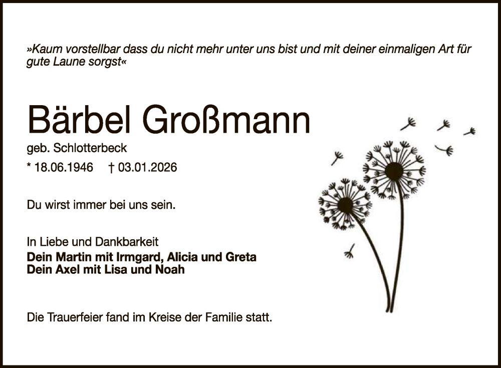 Hier finden Sie alle Traueranzeigen aus der Zeitung, die bisher für Bärbel Großmann erschienen sind. Weitere Traueranzeigen, die in der Zeitung erscheinen, werden hier ebenfalls aufgelistet