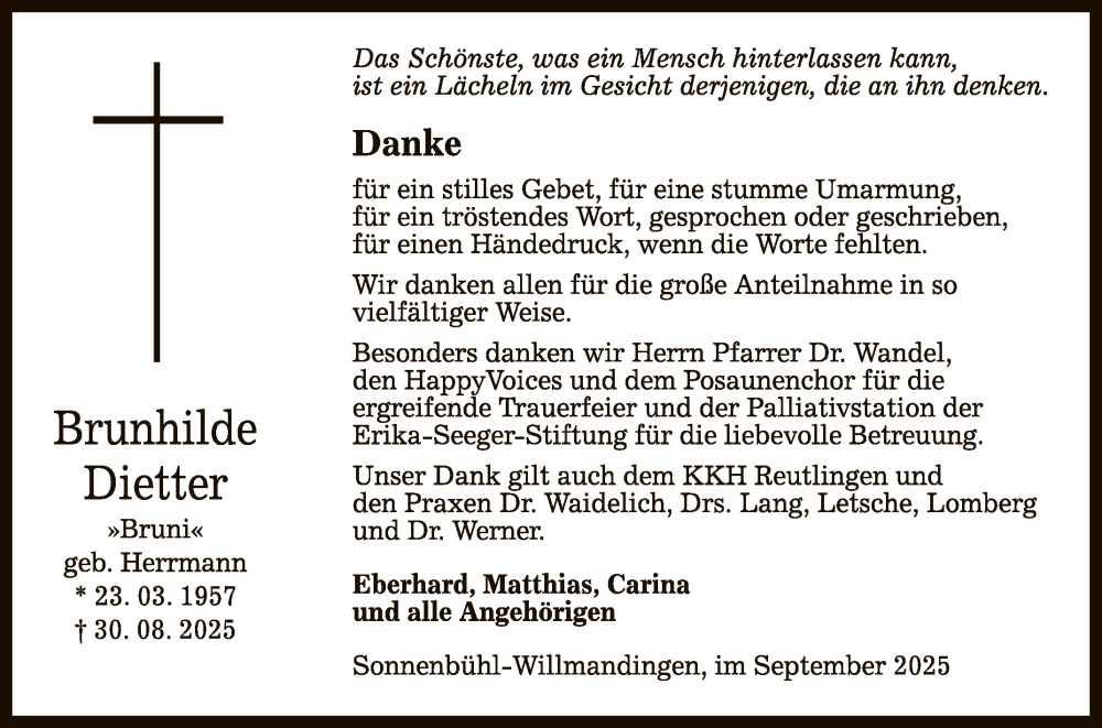 Hier finden Sie alle Traueranzeigen aus der Zeitung, die bisher für Brunhilde Dietter erschienen sind. Weitere Traueranzeigen, die in der Zeitung erscheinen, werden hier ebenfalls aufgelistet