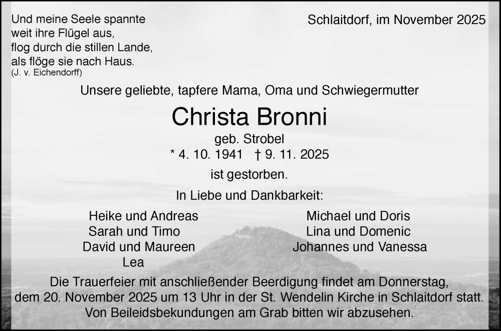 Hier finden Sie alle Traueranzeigen aus der Zeitung, die bisher für Christa Bronni erschienen sind. Weitere Traueranzeigen, die in der Zeitung erscheinen, werden hier ebenfalls aufgelistet