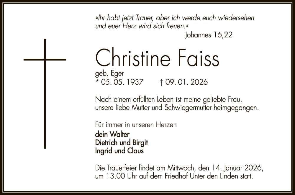 Hier finden Sie alle Traueranzeigen aus der Zeitung, die bisher für Christine Faiss erschienen sind. Weitere Traueranzeigen, die in der Zeitung erscheinen, werden hier ebenfalls aufgelistet