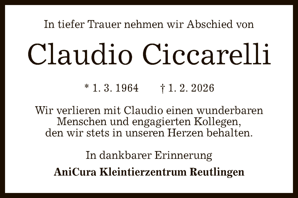Hier finden Sie alle Traueranzeigen aus der Zeitung, die bisher für Claudio Ciccarelli erschienen sind. Weitere Traueranzeigen, die in der Zeitung erscheinen, werden hier ebenfalls aufgelistet