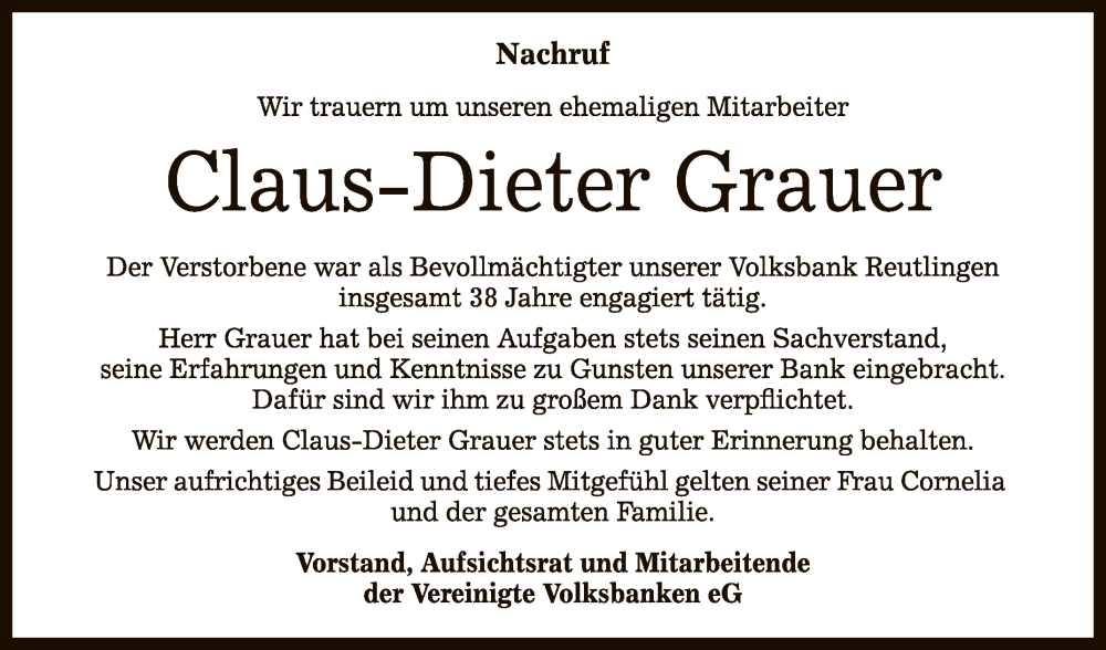 Hier finden Sie alle Traueranzeigen aus der Zeitung, die bisher für Claus-Dieter Grauer erschienen sind. Weitere Traueranzeigen, die in der Zeitung erscheinen, werden hier ebenfalls aufgelistet