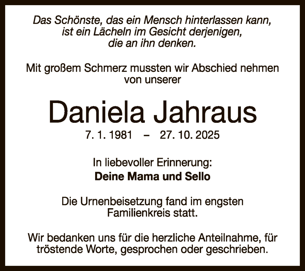 Hier finden Sie alle Traueranzeigen aus der Zeitung, die bisher für Daniela Jahraus erschienen sind. Weitere Traueranzeigen, die in der Zeitung erscheinen, werden hier ebenfalls aufgelistet