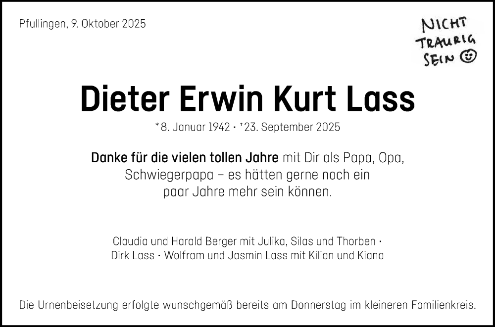 Hier finden Sie alle Traueranzeigen aus der Zeitung, die bisher für Dieter Erwin Kurt Lass erschienen sind. Weitere Traueranzeigen, die in der Zeitung erscheinen, werden hier ebenfalls aufgelistet