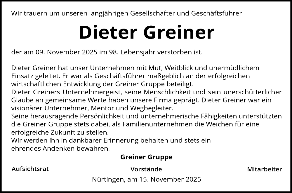 Hier finden Sie alle Traueranzeigen aus der Zeitung, die bisher für Dieter Greiner erschienen sind. Weitere Traueranzeigen, die in der Zeitung erscheinen, werden hier ebenfalls aufgelistet