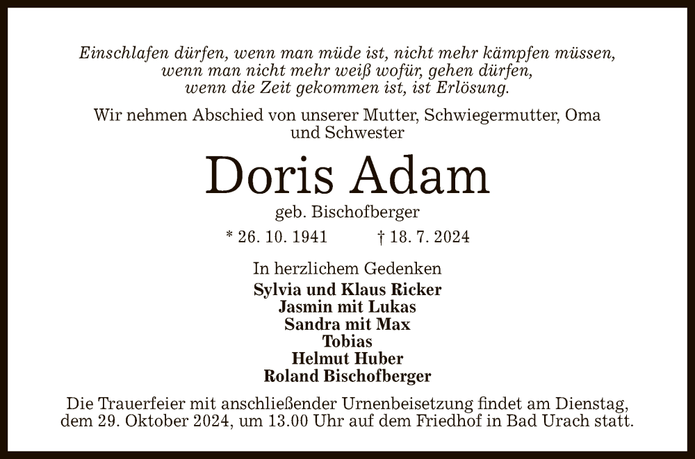 Hier finden Sie alle Traueranzeigen aus der Zeitung, die bisher für Doris Adam erschienen sind. Weitere Traueranzeigen, die in der Zeitung erscheinen, werden hier ebenfalls aufgelistet