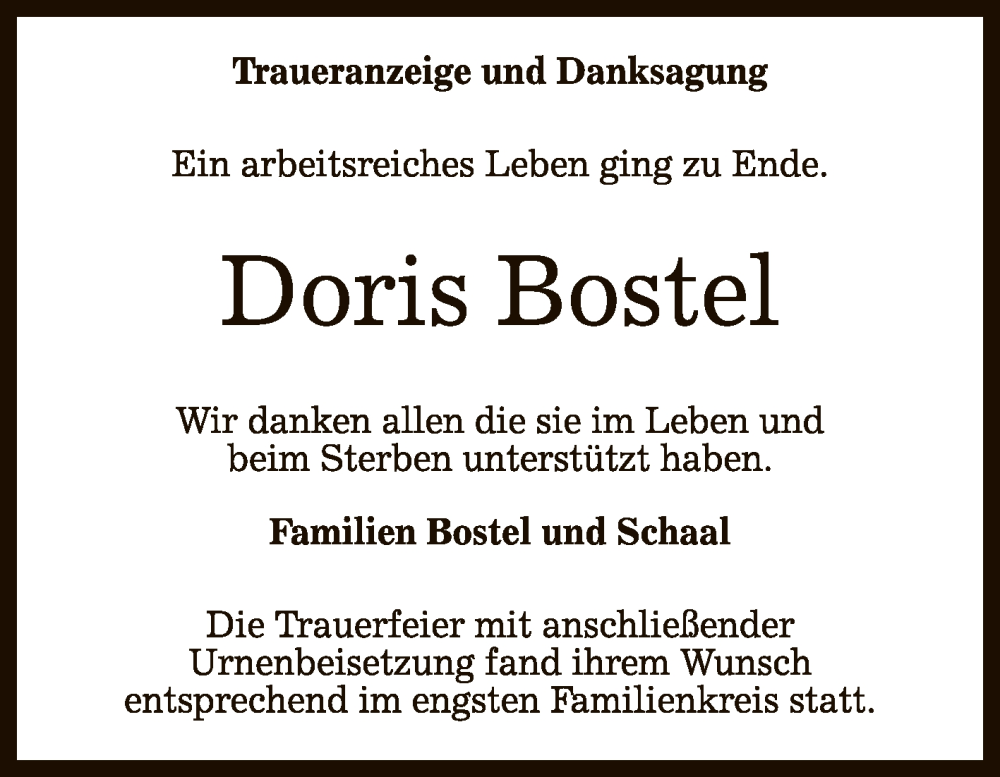Hier finden Sie alle Traueranzeigen aus der Zeitung, die bisher für Doris Bostel erschienen sind. Weitere Traueranzeigen, die in der Zeitung erscheinen, werden hier ebenfalls aufgelistet