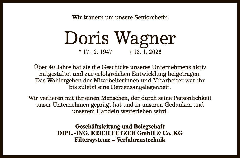 Hier finden Sie alle Traueranzeigen aus der Zeitung, die bisher für Doris Wagner erschienen sind. Weitere Traueranzeigen, die in der Zeitung erscheinen, werden hier ebenfalls aufgelistet