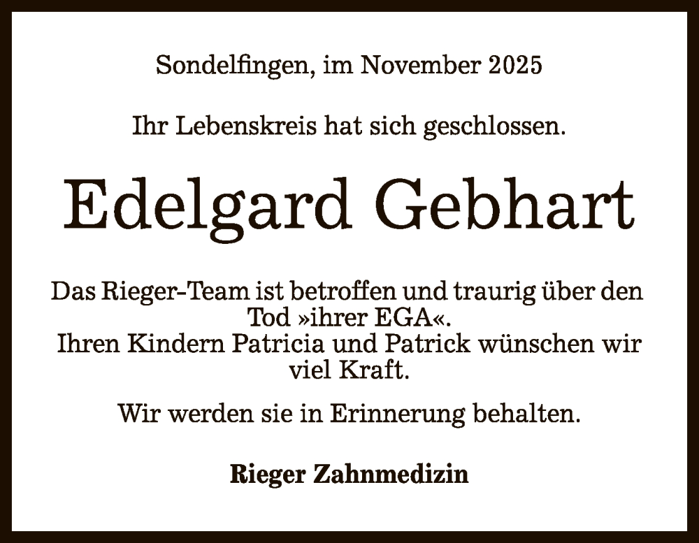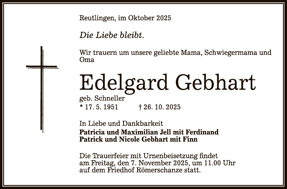 Hier finden Sie alle Traueranzeigen aus der Zeitung, die bisher für Edelgard Gebhart erschienen sind. Weitere Traueranzeigen, die in der Zeitung erscheinen, werden hier ebenfalls aufgelistet