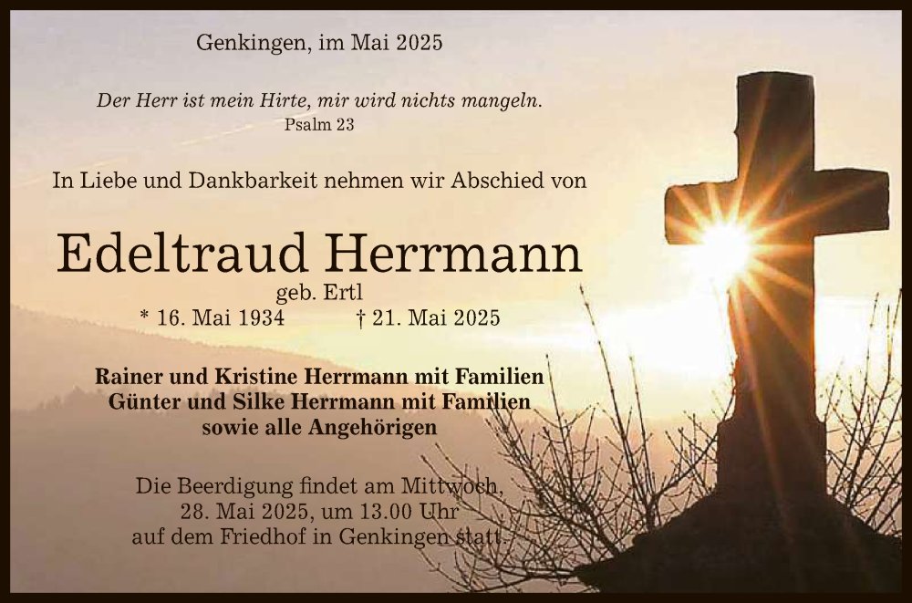 Hier finden Sie alle Traueranzeigen aus der Zeitung, die bisher für Edeltraud Herrmann erschienen sind. Weitere Traueranzeigen, die in der Zeitung erscheinen, werden hier ebenfalls aufgelistet