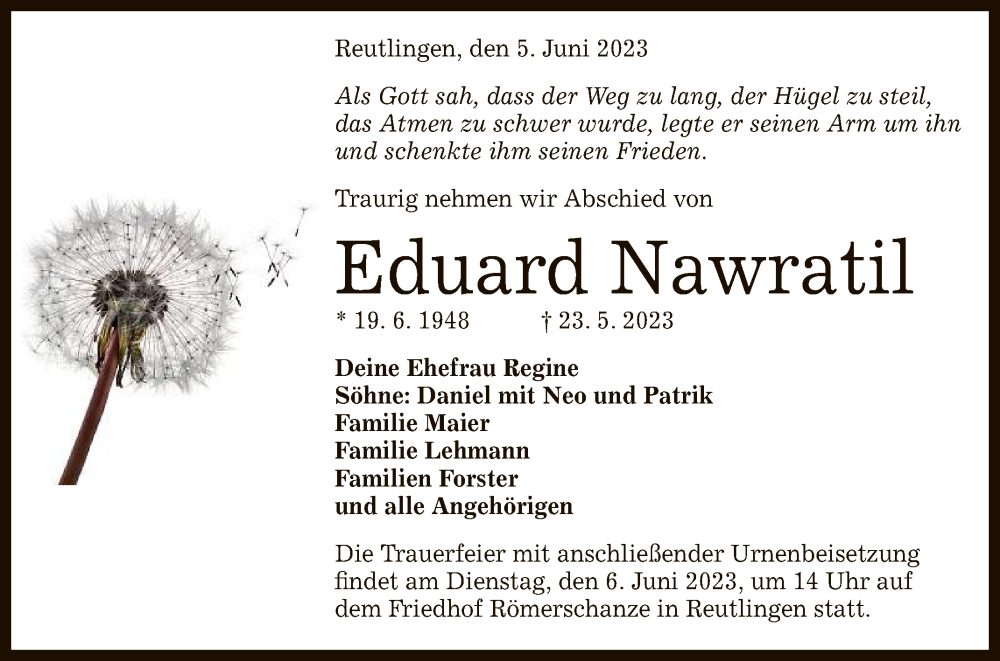 Hier finden Sie alle Traueranzeigen aus der Zeitung, die bisher für Eduard Nawratil erschienen sind. Weitere Traueranzeigen, die in der Zeitung erscheinen, werden hier ebenfalls aufgelistet