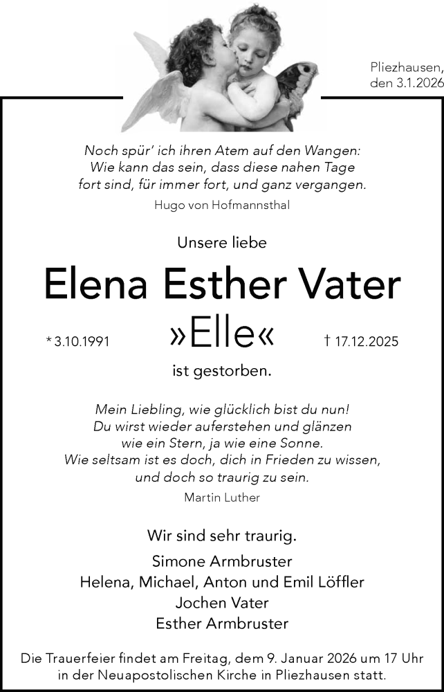 Hier finden Sie alle Traueranzeigen aus der Zeitung, die bisher für Elena Esther Vater erschienen sind. Weitere Traueranzeigen, die in der Zeitung erscheinen, werden hier ebenfalls aufgelistet