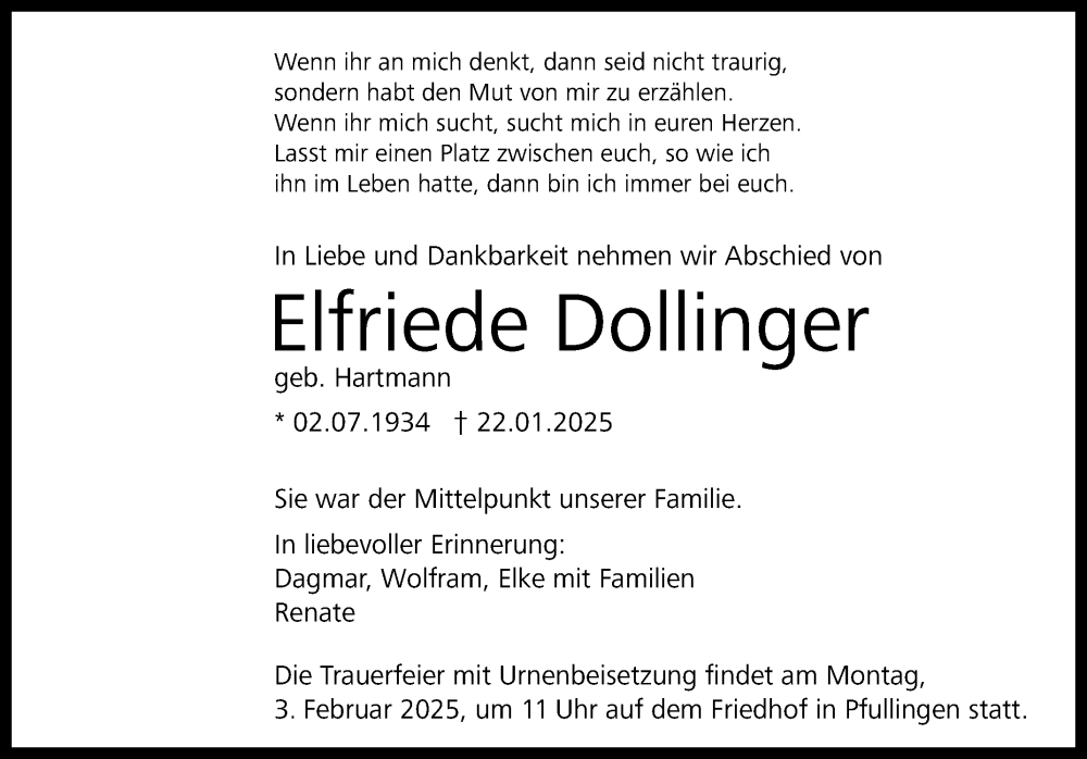 Hier finden Sie alle Traueranzeigen aus der Zeitung, die bisher für Elfriede Dollinger erschienen sind. Weitere Traueranzeigen, die in der Zeitung erscheinen, werden hier ebenfalls aufgelistet