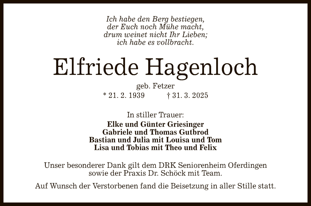 Hier finden Sie alle Traueranzeigen aus der Zeitung, die bisher für Elfriede Hagenloch erschienen sind. Weitere Traueranzeigen, die in der Zeitung erscheinen, werden hier ebenfalls aufgelistet