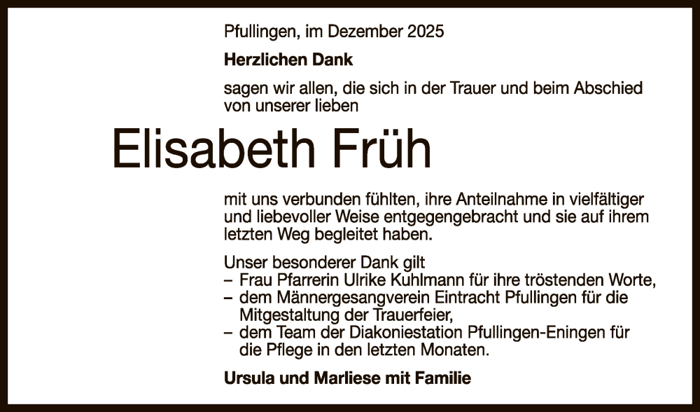Hier finden Sie alle Traueranzeigen aus der Zeitung, die bisher für Elisabeth Früh erschienen sind. Weitere Traueranzeigen, die in der Zeitung erscheinen, werden hier ebenfalls aufgelistet