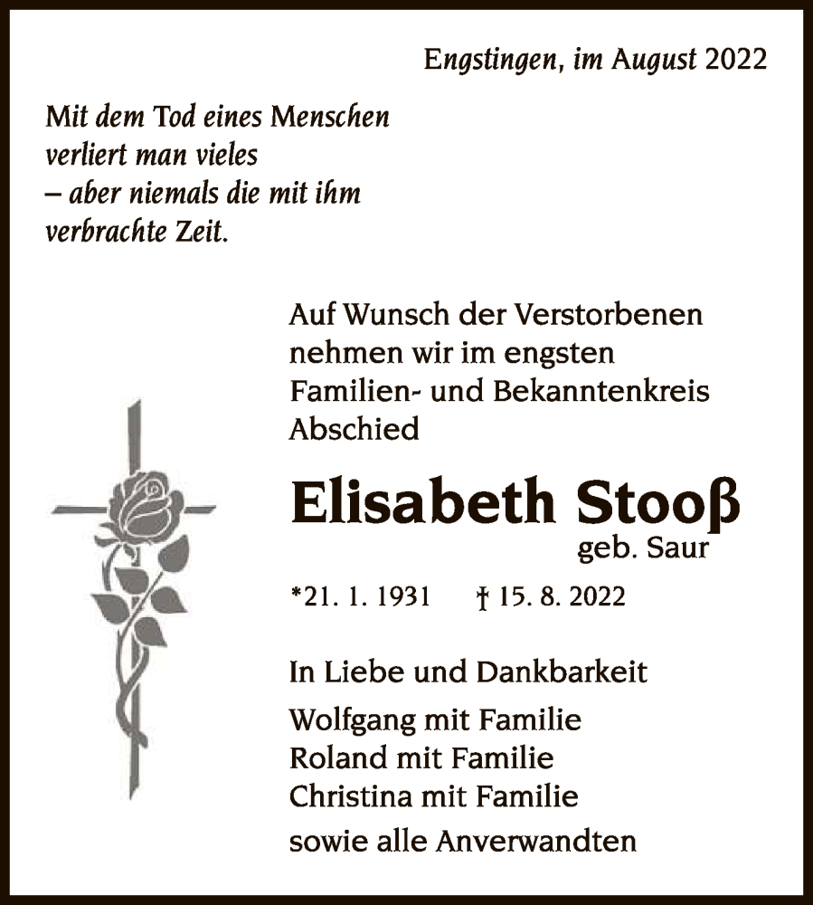Hier finden Sie alle Traueranzeigen aus der Zeitung, die bisher für Elisabeth Stooß erschienen sind. Weitere Traueranzeigen, die in der Zeitung erscheinen, werden hier ebenfalls aufgelistet