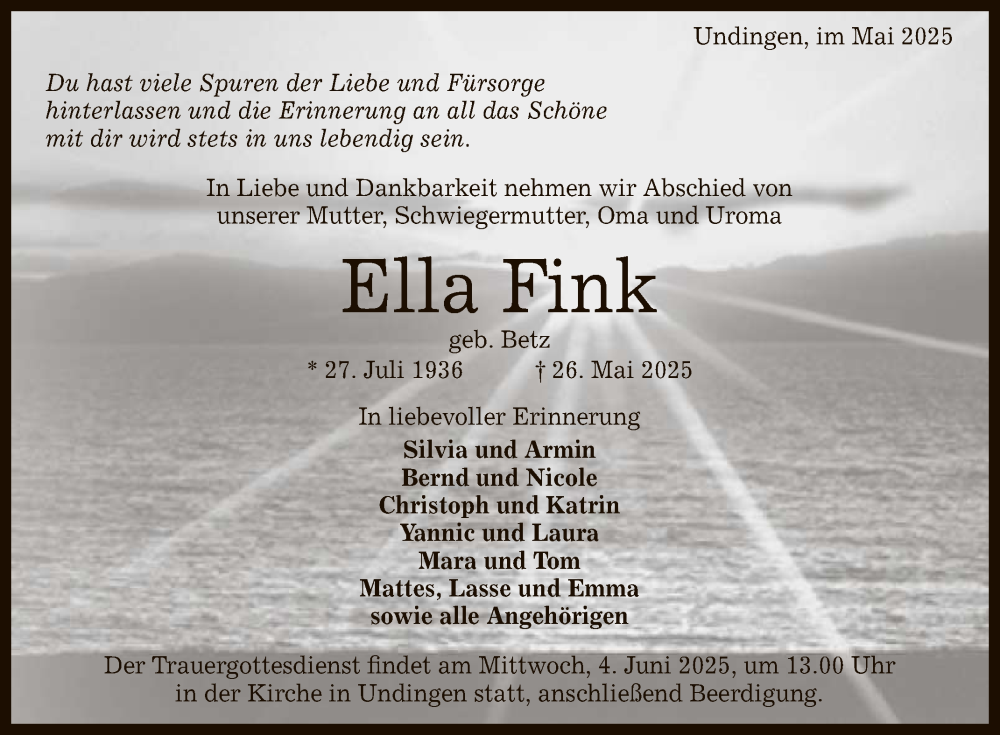 Hier finden Sie alle Traueranzeigen aus der Zeitung, die bisher für Ella Fink erschienen sind. Weitere Traueranzeigen, die in der Zeitung erscheinen, werden hier ebenfalls aufgelistet