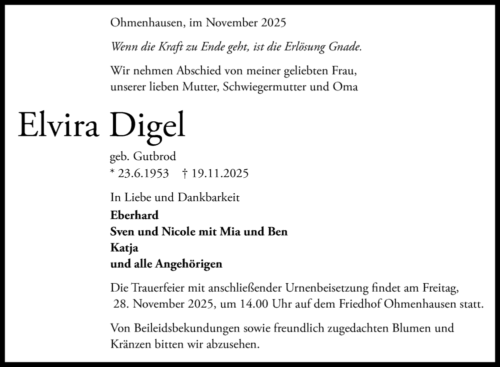 Hier finden Sie alle Traueranzeigen aus der Zeitung, die bisher für Elvira Digel erschienen sind. Weitere Traueranzeigen, die in der Zeitung erscheinen, werden hier ebenfalls aufgelistet