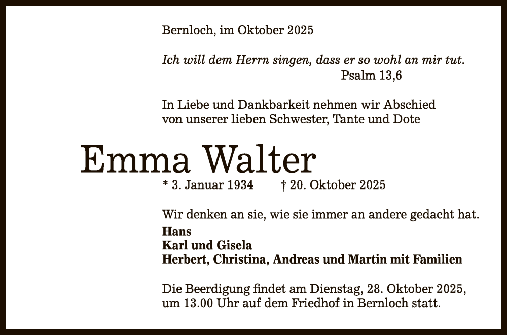 Hier finden Sie alle Traueranzeigen aus der Zeitung, die bisher für Emma Walter erschienen sind. Weitere Traueranzeigen, die in der Zeitung erscheinen, werden hier ebenfalls aufgelistet