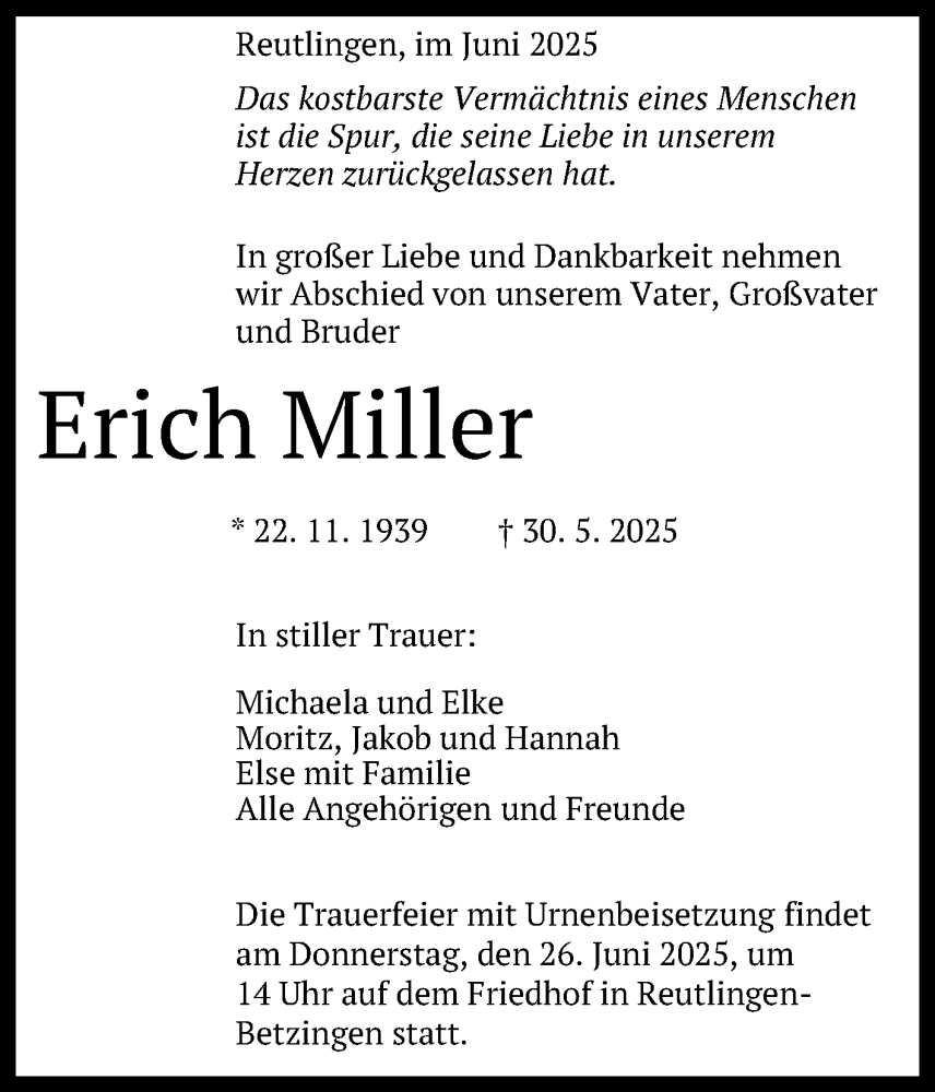 Hier finden Sie alle Traueranzeigen aus der Zeitung, die bisher für Erich Miller erschienen sind. Weitere Traueranzeigen, die in der Zeitung erscheinen, werden hier ebenfalls aufgelistet