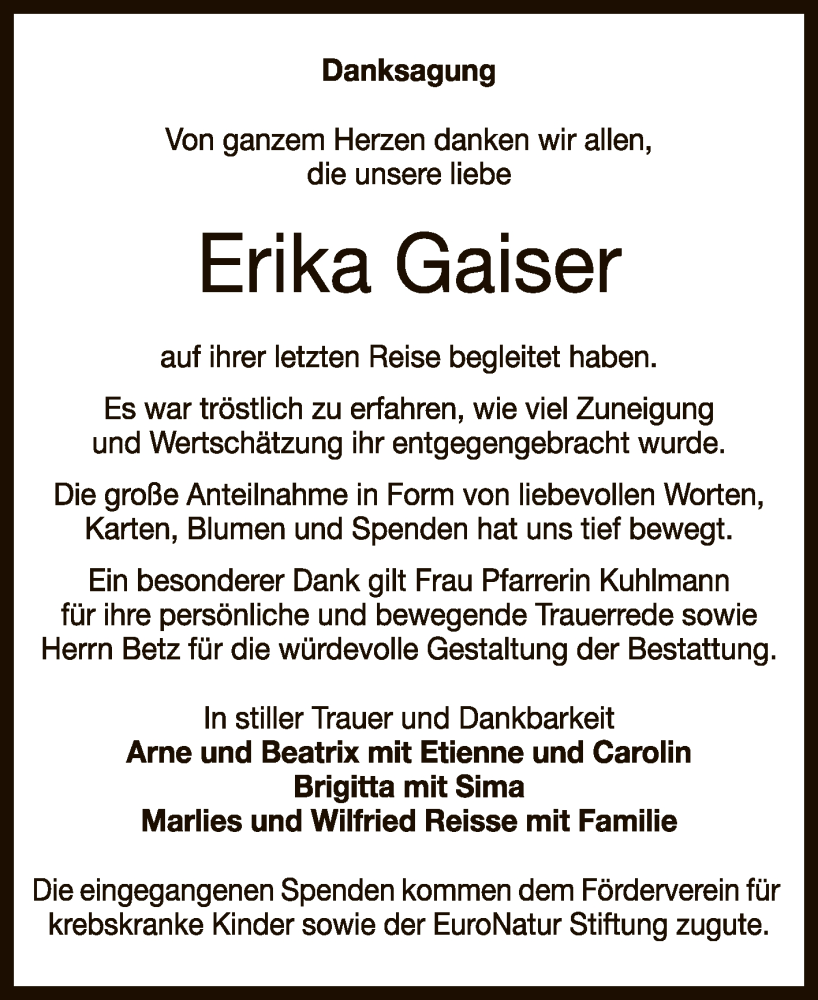 Hier finden Sie alle Traueranzeigen aus der Zeitung, die bisher für Erika Gaiser erschienen sind. Weitere Traueranzeigen, die in der Zeitung erscheinen, werden hier ebenfalls aufgelistet