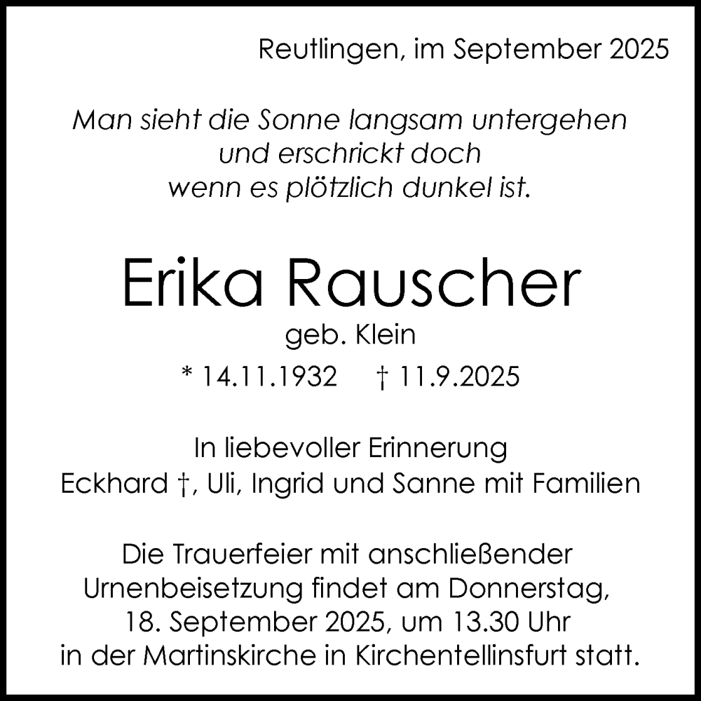 Hier finden Sie alle Traueranzeigen aus der Zeitung, die bisher für Erika Rauscher erschienen sind. Weitere Traueranzeigen, die in der Zeitung erscheinen, werden hier ebenfalls aufgelistet