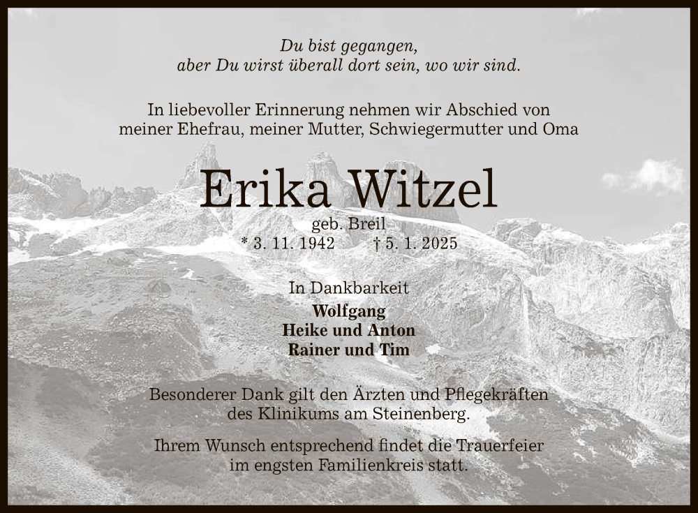 Hier finden Sie alle Traueranzeigen aus der Zeitung, die bisher für Erika Witzel erschienen sind. Weitere Traueranzeigen, die in der Zeitung erscheinen, werden hier ebenfalls aufgelistet
