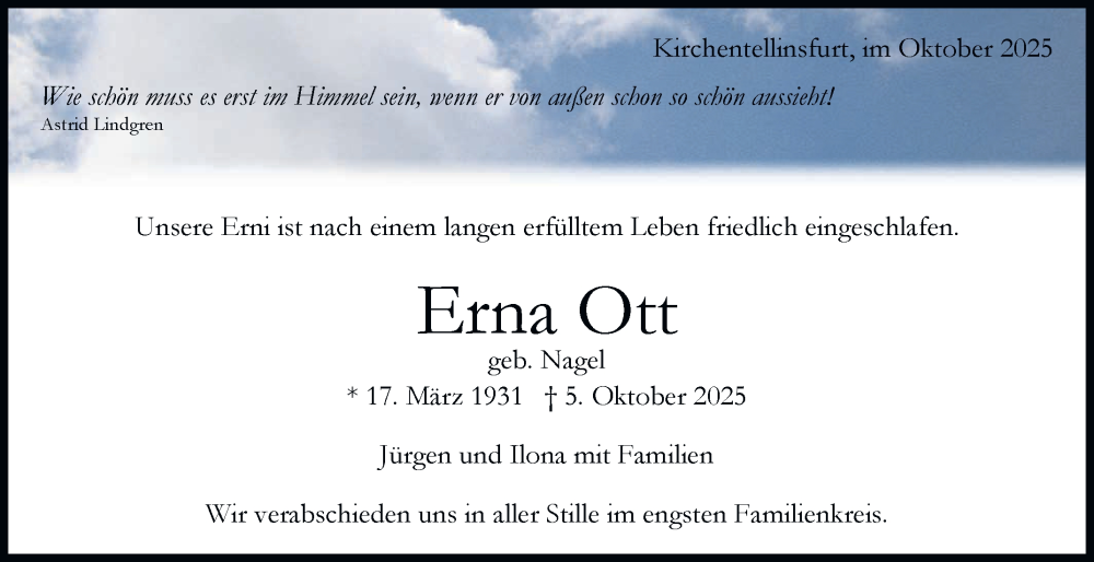 Hier finden Sie alle Traueranzeigen aus der Zeitung, die bisher für Erna Ott erschienen sind. Weitere Traueranzeigen, die in der Zeitung erscheinen, werden hier ebenfalls aufgelistet