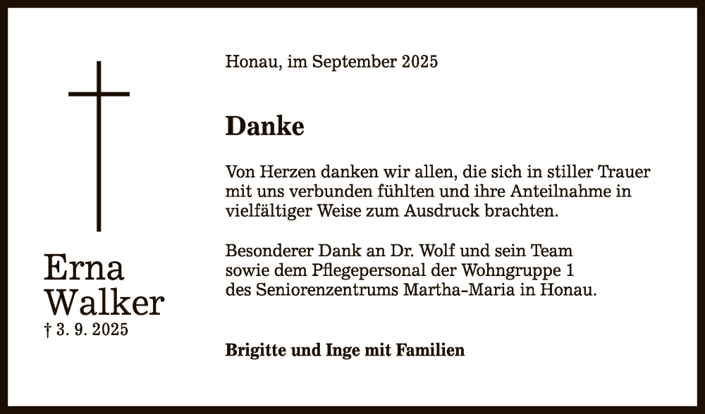 Hier finden Sie alle Traueranzeigen aus der Zeitung, die bisher für Erna Walker erschienen sind. Weitere Traueranzeigen, die in der Zeitung erscheinen, werden hier ebenfalls aufgelistet
