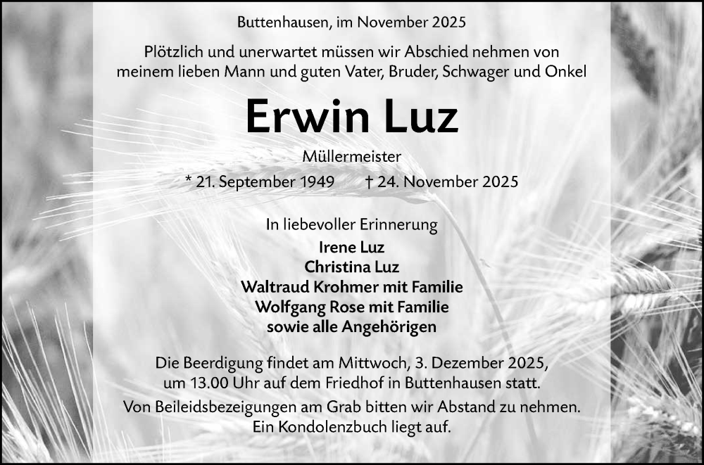 Hier finden Sie alle Traueranzeigen aus der Zeitung, die bisher für Erwin Luz erschienen sind. Weitere Traueranzeigen, die in der Zeitung erscheinen, werden hier ebenfalls aufgelistet