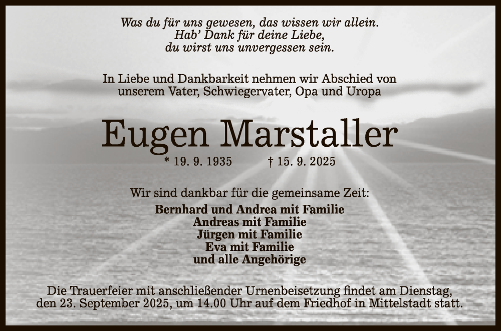 Hier finden Sie alle Traueranzeigen aus der Zeitung, die bisher für Eugen Marstaller erschienen sind. Weitere Traueranzeigen, die in der Zeitung erscheinen, werden hier ebenfalls aufgelistet