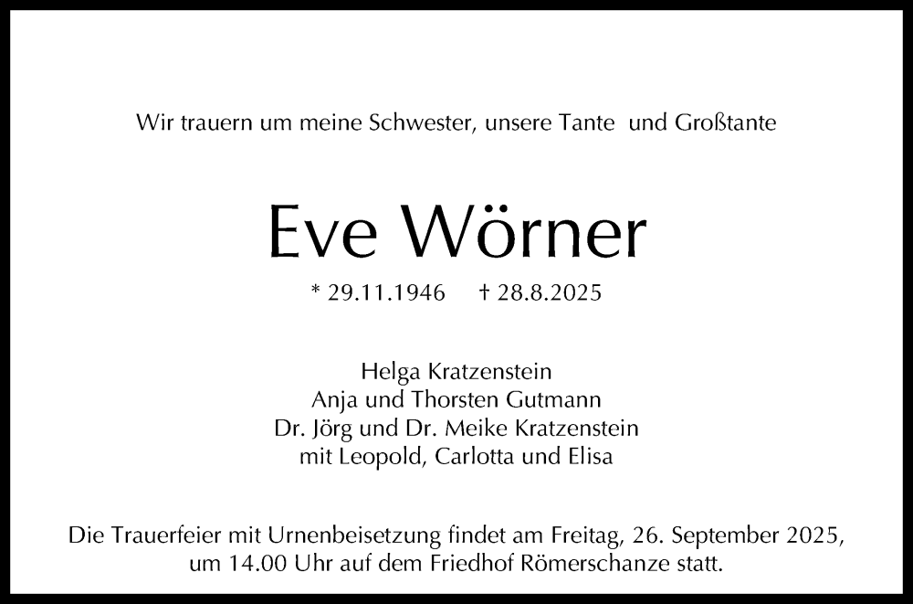 Hier finden Sie alle Traueranzeigen aus der Zeitung, die bisher für Eve Wörner erschienen sind. Weitere Traueranzeigen, die in der Zeitung erscheinen, werden hier ebenfalls aufgelistet