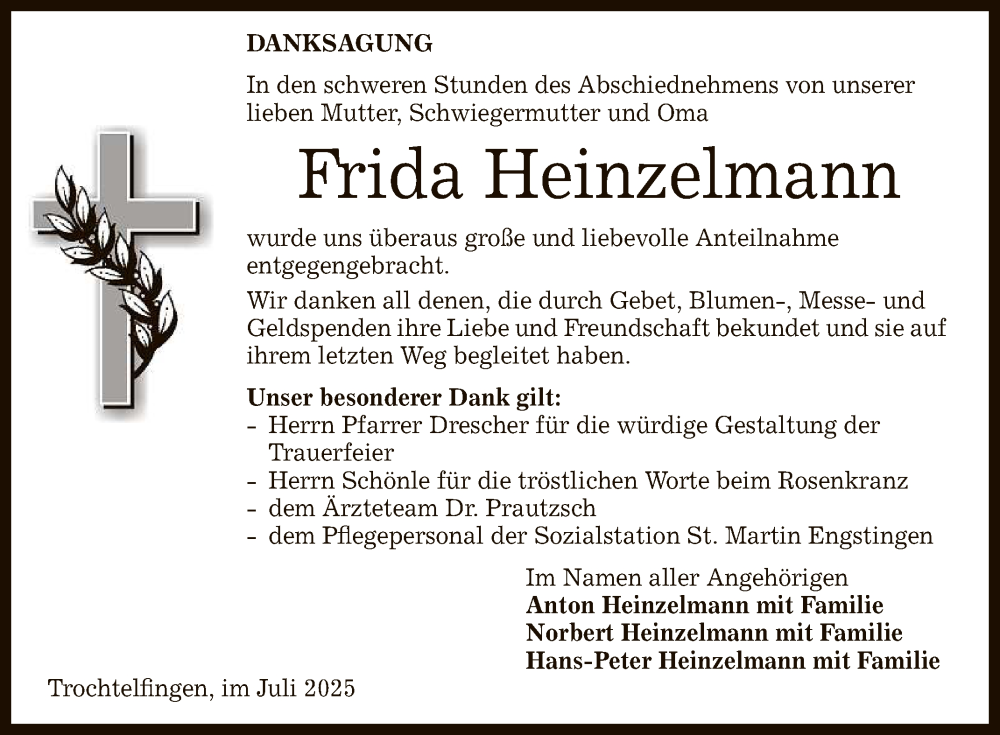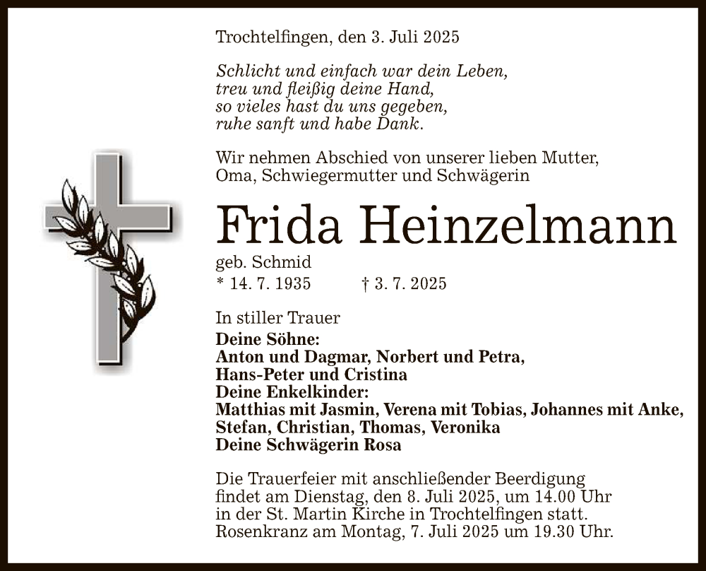 Hier finden Sie alle Traueranzeigen aus der Zeitung, die bisher für Frida Heinzelmann erschienen sind. Weitere Traueranzeigen, die in der Zeitung erscheinen, werden hier ebenfalls aufgelistet