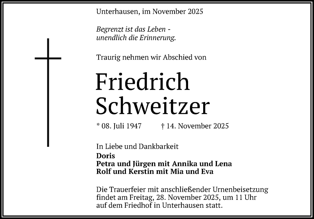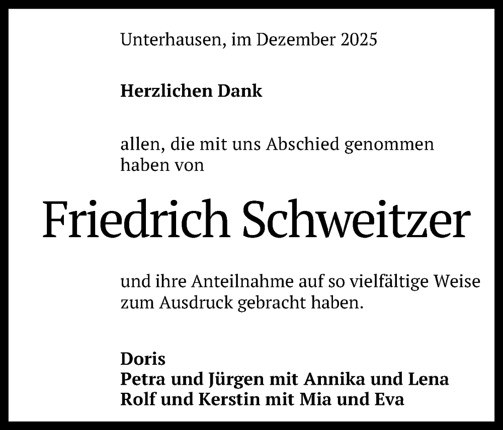 Hier finden Sie alle Traueranzeigen aus der Zeitung, die bisher für Friedrich Schweitzer erschienen sind. Weitere Traueranzeigen, die in der Zeitung erscheinen, werden hier ebenfalls aufgelistet