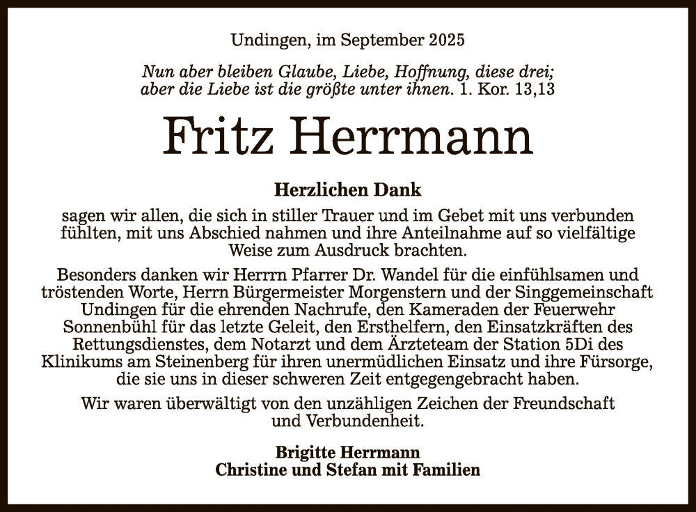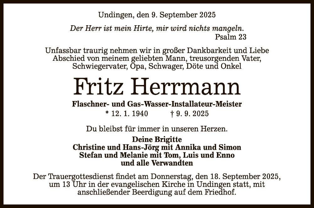 Hier finden Sie alle Traueranzeigen aus der Zeitung, die bisher für Fritz Herrmann erschienen sind. Weitere Traueranzeigen, die in der Zeitung erscheinen, werden hier ebenfalls aufgelistet