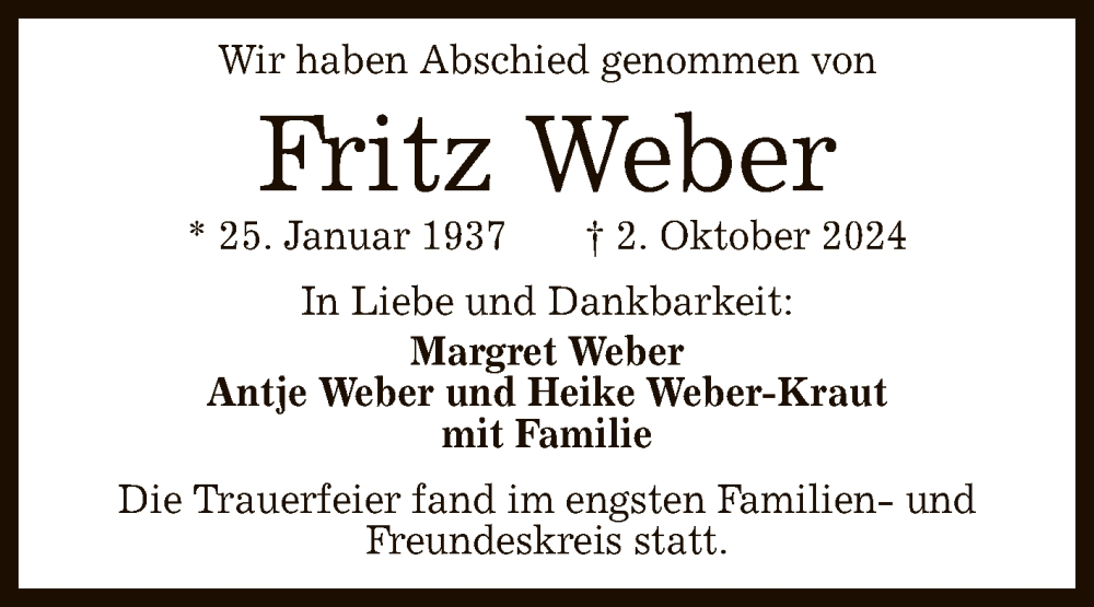 Hier finden Sie alle Traueranzeigen aus der Zeitung, die bisher für Fritz Weber erschienen sind. Weitere Traueranzeigen, die in der Zeitung erscheinen, werden hier ebenfalls aufgelistet
