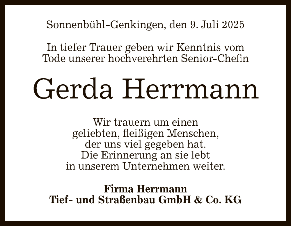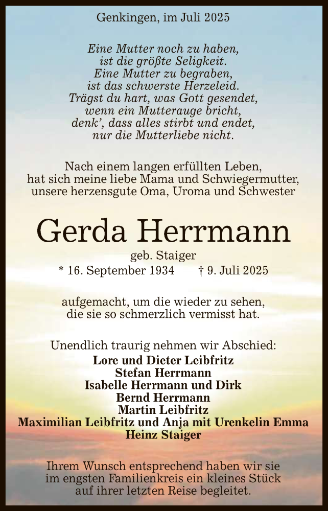 Hier finden Sie alle Traueranzeigen aus der Zeitung, die bisher für Gerda Herrmann erschienen sind. Weitere Traueranzeigen, die in der Zeitung erscheinen, werden hier ebenfalls aufgelistet