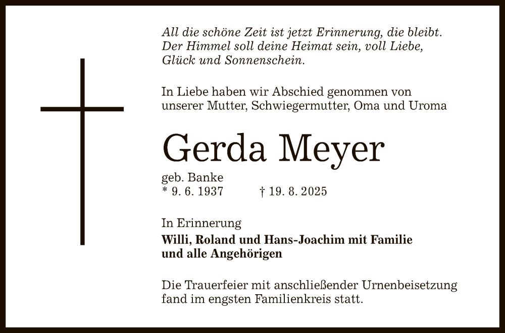 Hier finden Sie alle Traueranzeigen aus der Zeitung, die bisher für Gerda Meyer erschienen sind. Weitere Traueranzeigen, die in der Zeitung erscheinen, werden hier ebenfalls aufgelistet