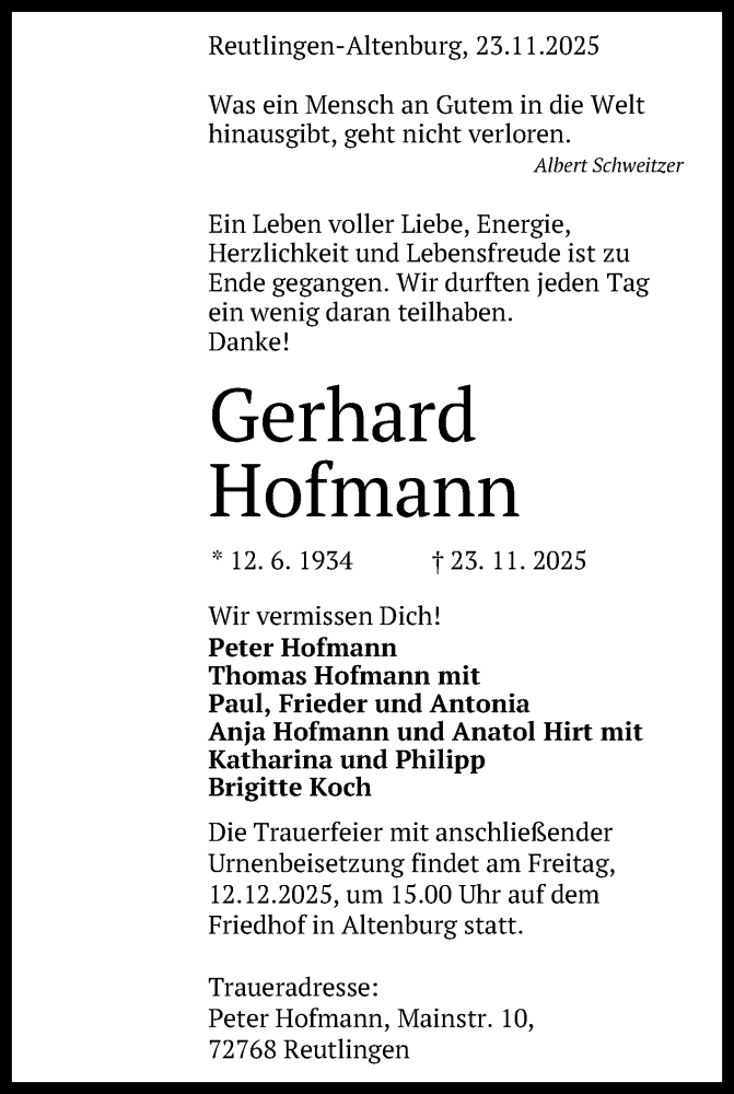 Hier finden Sie alle Traueranzeigen aus der Zeitung, die bisher für Gerhard Hofmann erschienen sind. Weitere Traueranzeigen, die in der Zeitung erscheinen, werden hier ebenfalls aufgelistet